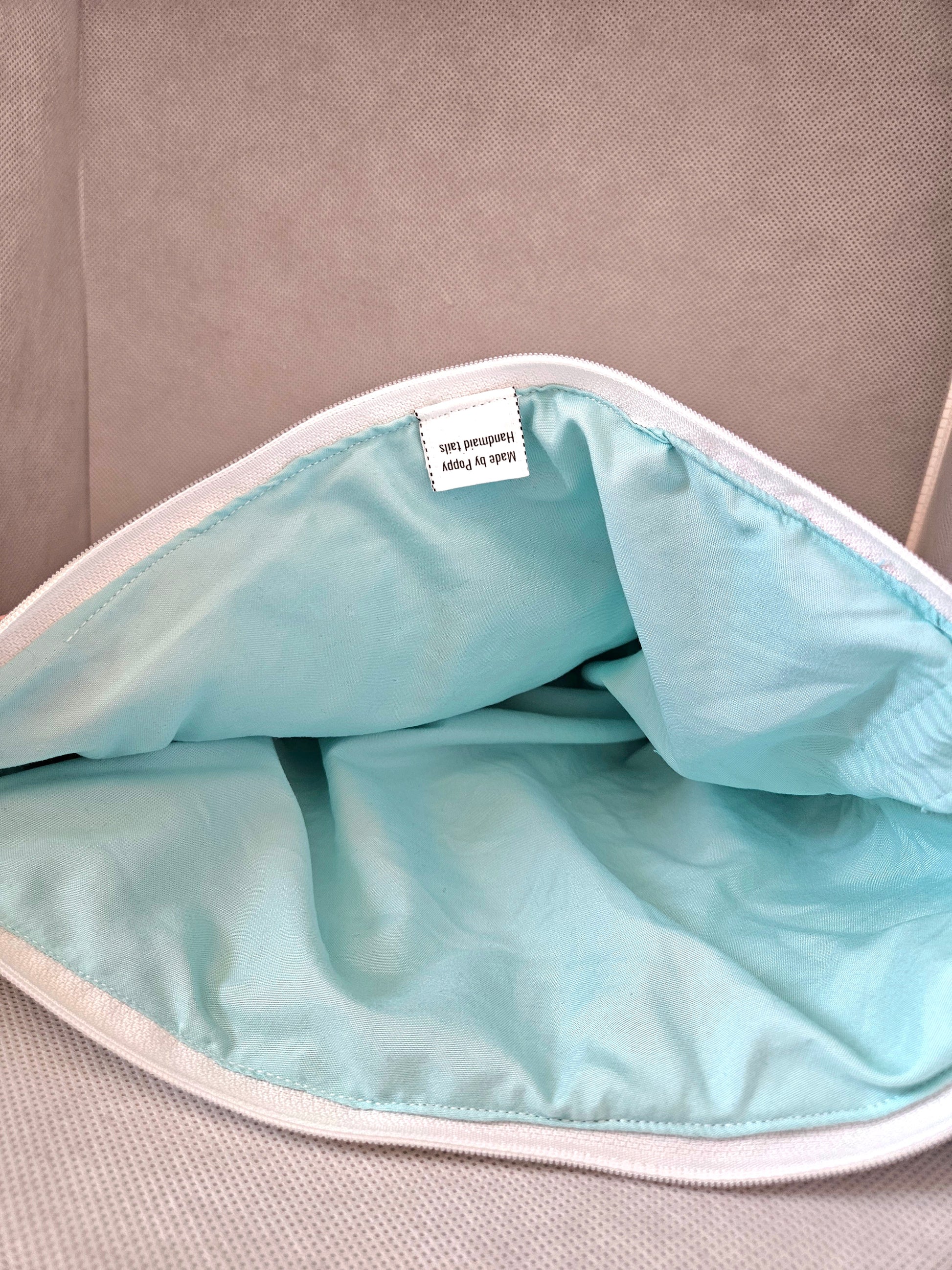 This large blue toilet bag features a padded design and secure zip closure, ensuring your toiletries stay protected and organized. Its lined interior adds durability and easy cleaning, while the elegant flower pattern offers a stylish touch. Ideal for travel or daily use, this bag combines practicality with aesthetic appeal.