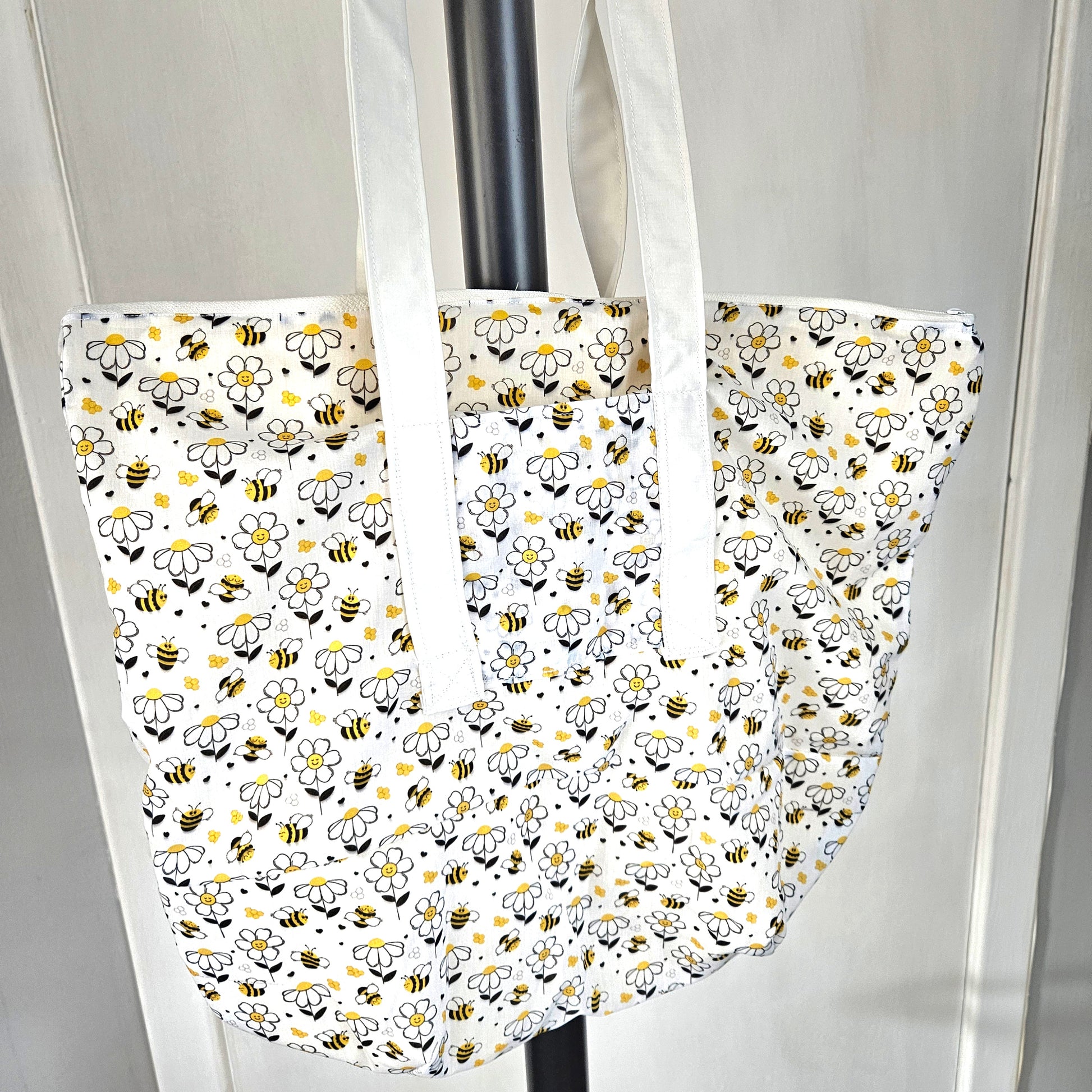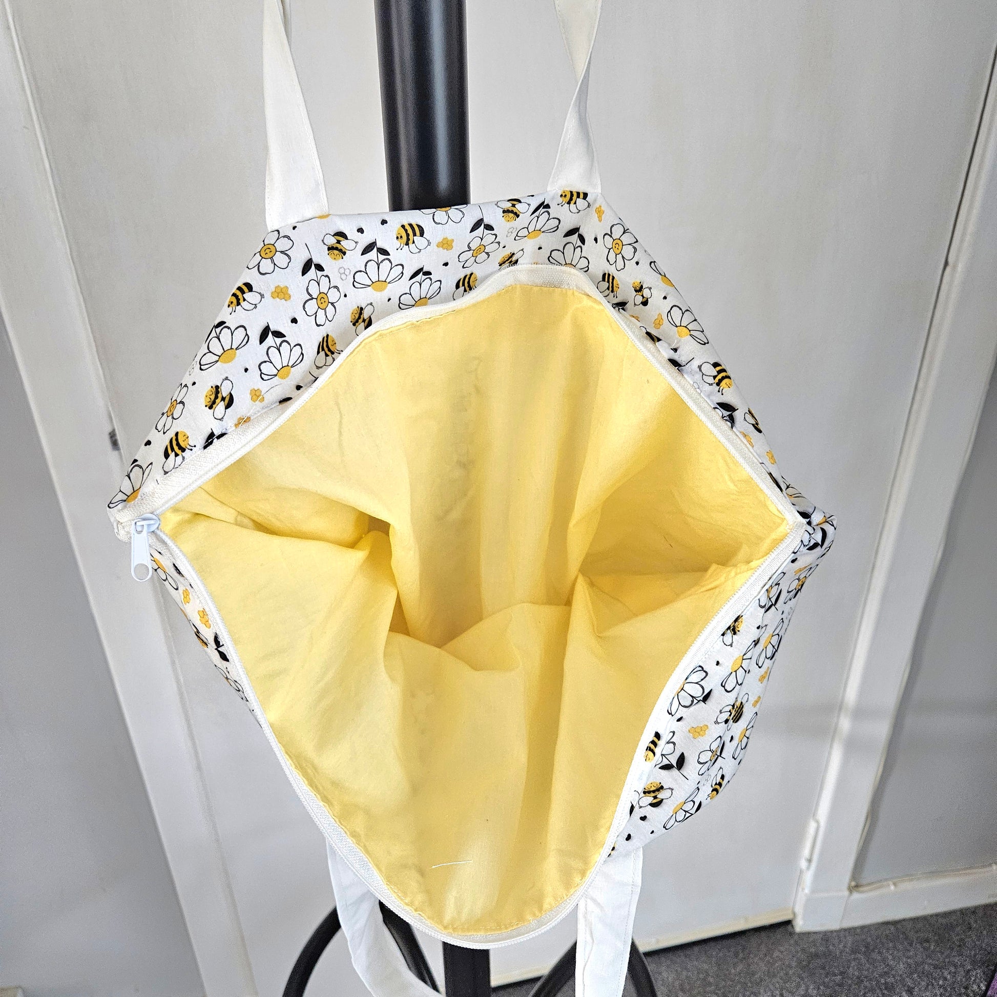 This white and yellow bumble bee shopping tote bag combines practical design with charming style. Featuring a secure zipper fastening, it ensures your belongings stay safely inside while you shop. The vibrant bumble bee pattern adds a cheerful touch, making it both a functional and fashionable accessory for everyday use. Durable and spacious, this tote is ideal for carrying shopping or personal items with ease and confidence.